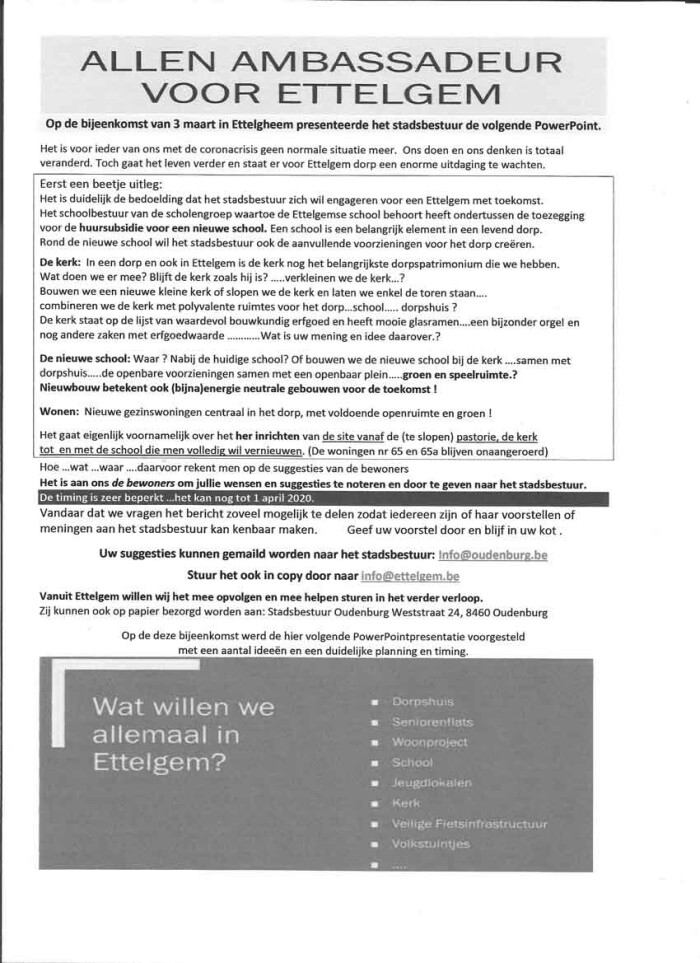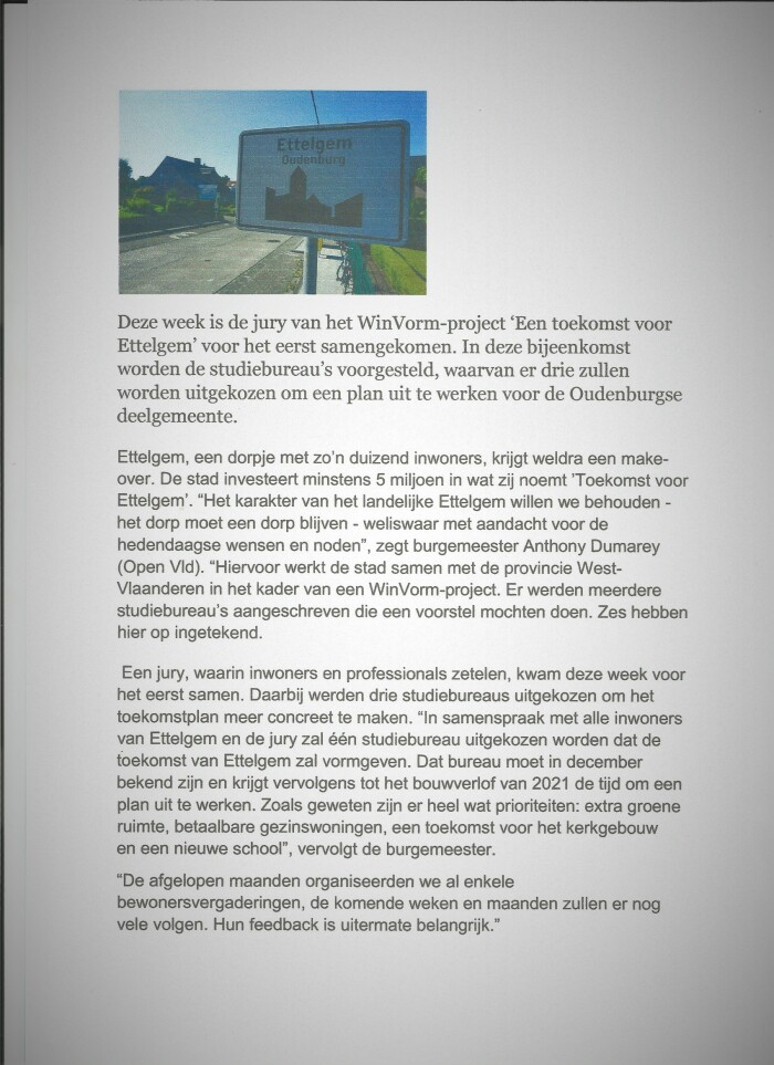Pas op de tijd tikt ,we naderen 01/04/2020 dus hoogtijd voor uw opmerkingen door te geven aan: info@oudenburg.be met eventueel met cc naar info@ettelgem.be .Vanuit Ettelgem willen wij het mee opvolgen en helpen sturen in het verder verloop.